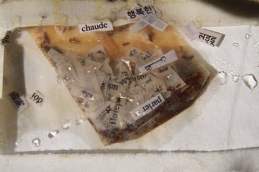 À travers les migrants, j’explore l’expérience de chacun en matière de communication ambiguë avec les autres. Fondant dans le thé, ces mots s’infusent, se libèrent, se rencontrent pour composer de nouvelles significations, et finissent par se perdre…